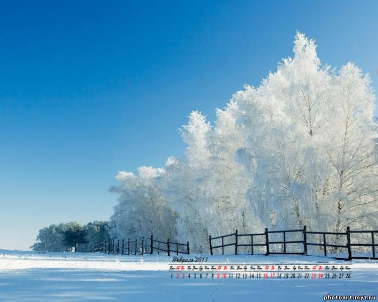 Календарь-обои на рабочий стол февраль 2013 "Зимний лес". Скачать бесплатно все размеры 1280х1024, широкоформатные 1366х768 1680х1050 1920х1080 по ссылке внизу, в комментарии.