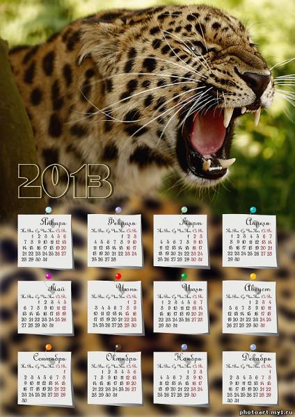 Скачать бесплатно календарь на 2013 год "Оскал Леопарда" вертикальный, в большом разрешении 2480х3508 для печати в формате А4 или качественной печати плаката.