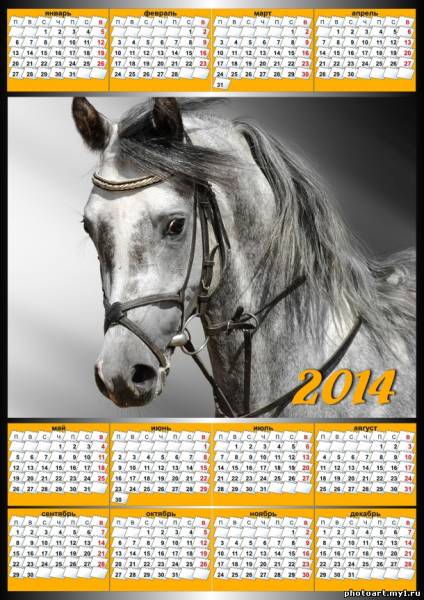 Календарь 2014 Год Лошади. Большой размер 2480х3508 для печати в формате А4 или качественной печати плаката.