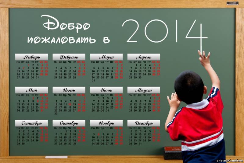 Скачать бесплатно без регистрации горизонтальный календарь на 2014 год Школьный, Ученик у доски. Большой размер 3508х2370 с российскими праздниками для печати в формате А4 или качественной печати плаката в формате А2 А3