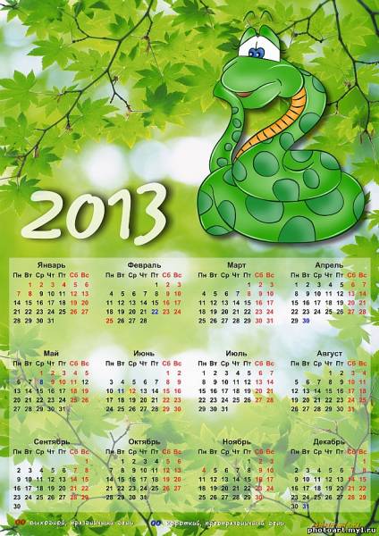 Скачать бесплатно календарь на 2013 год "Год Змеи" большой размер 2480х3508 для печати в формате А4 или качественной печати плаката.