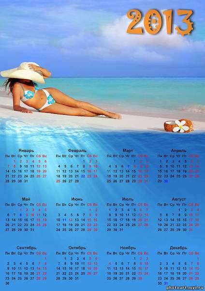 Календарь на 2013 год "Девушка на пляже" в большом размере 2480х3508 в отличном качестве для печати А4 или печати плаката. Ссылка для скачивания внизу в комментариях под календарём.