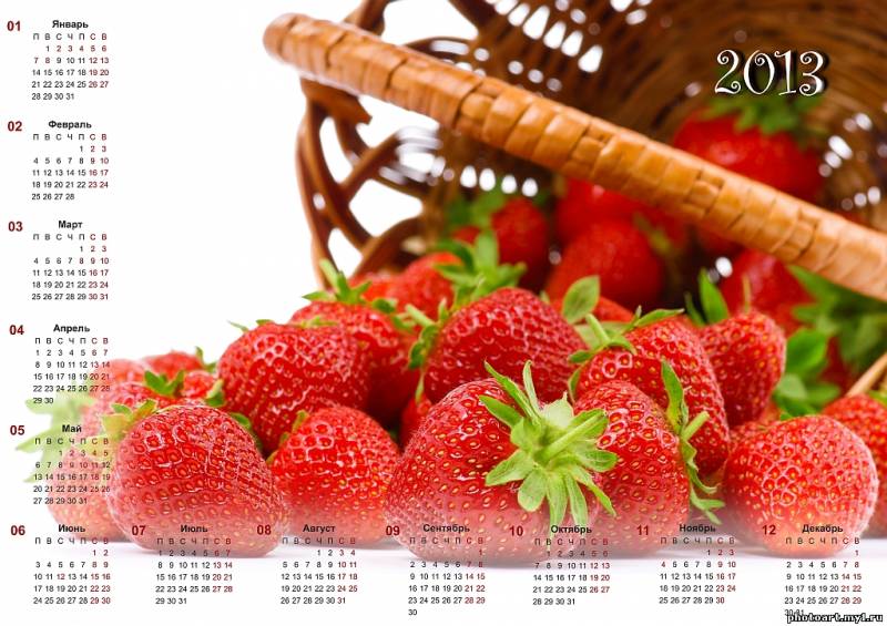 Скачать бесплатно календарь на 2013 год "Клубника". Горизонтальный, в большом разрешении 3508х2480 для печати в формате А4 или качественной печати плаката.